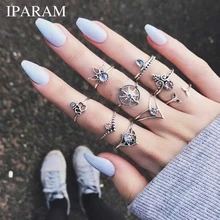 IPARAM 9 pçs/set Boêmio Sereia Cauda Bússola Yoga Gota de Água Oco Esculpida de cristal Mulheres Anel Conjunto