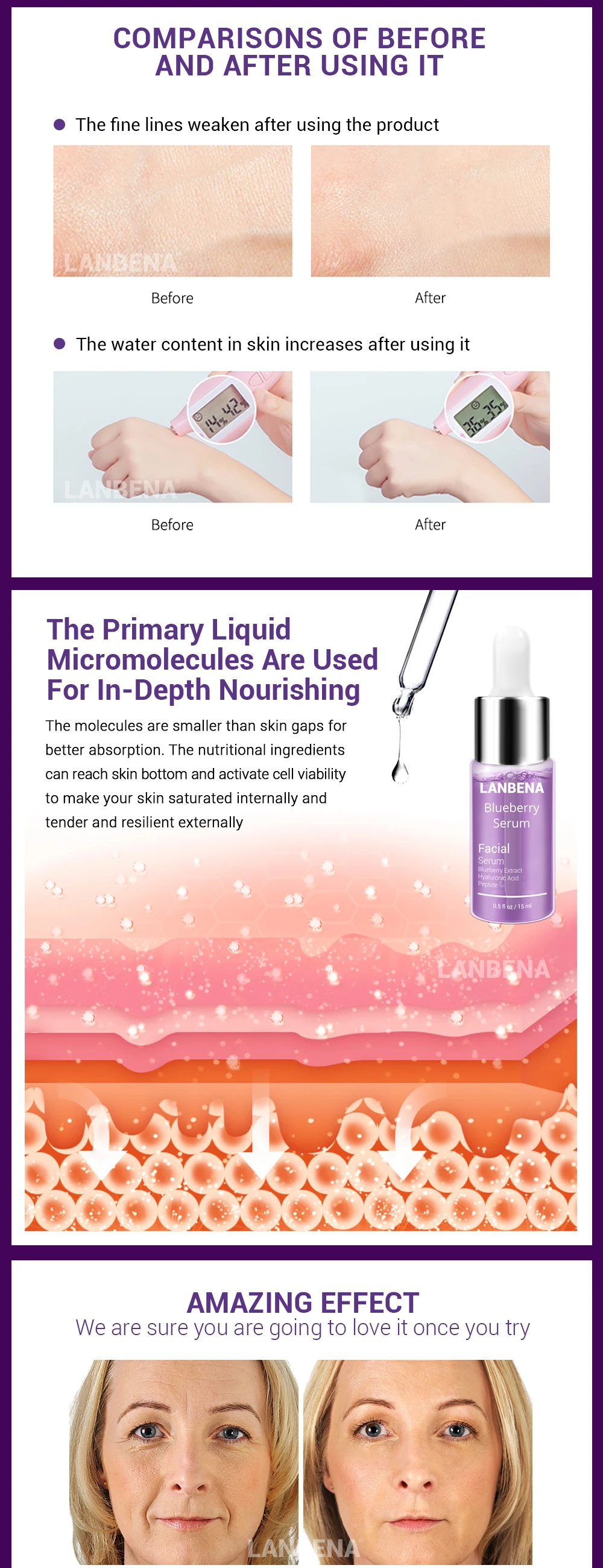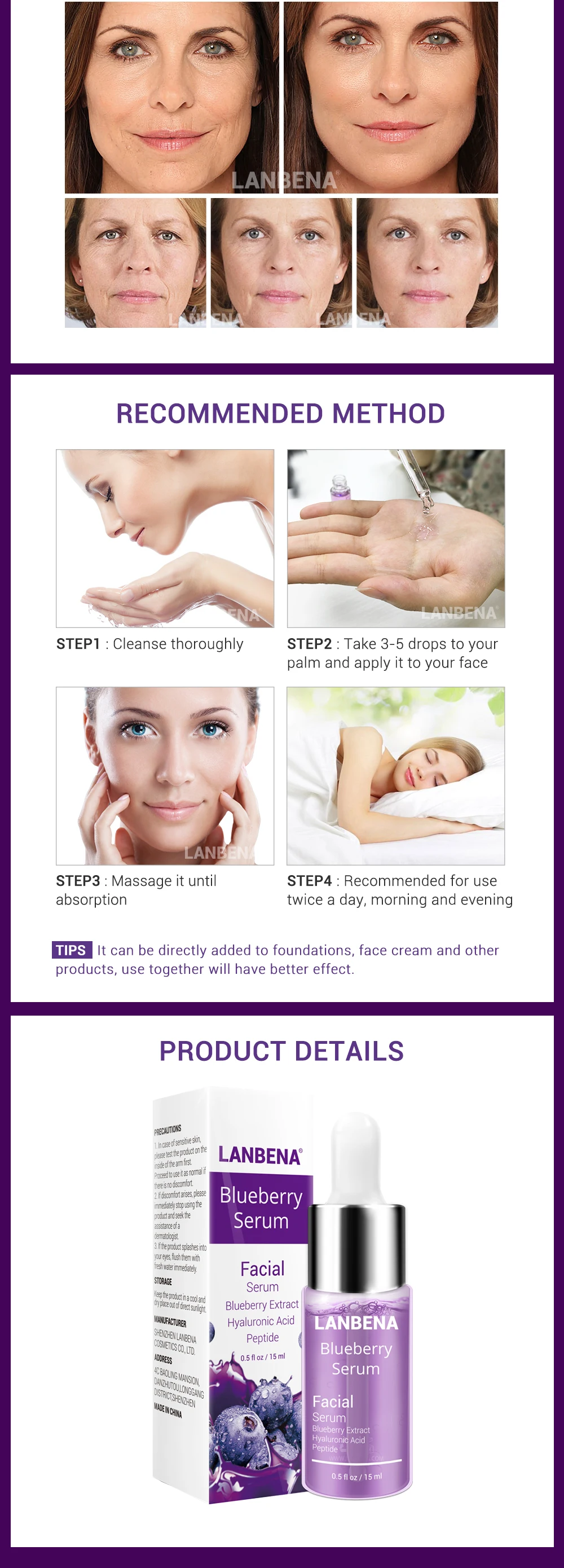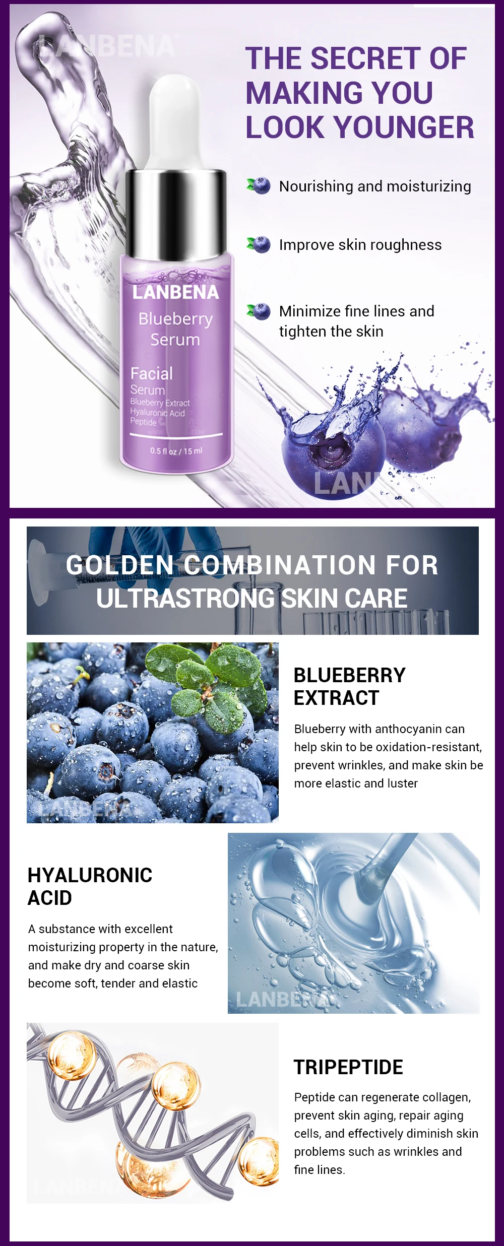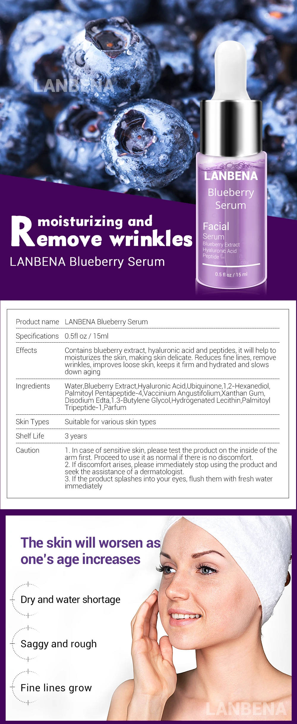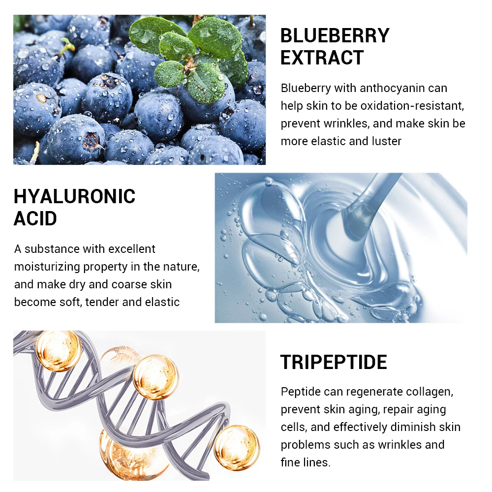 Efeitos: Contém extrato de mirtilo, ácido hialurônico e peptídeos, ele vai ajudar a hidrata a pele, fazer a pele delicada. Reduz linhas finas, remover rugas, melhora a pele solta, mantém firme e hidratada e retarda o envelhecimento.